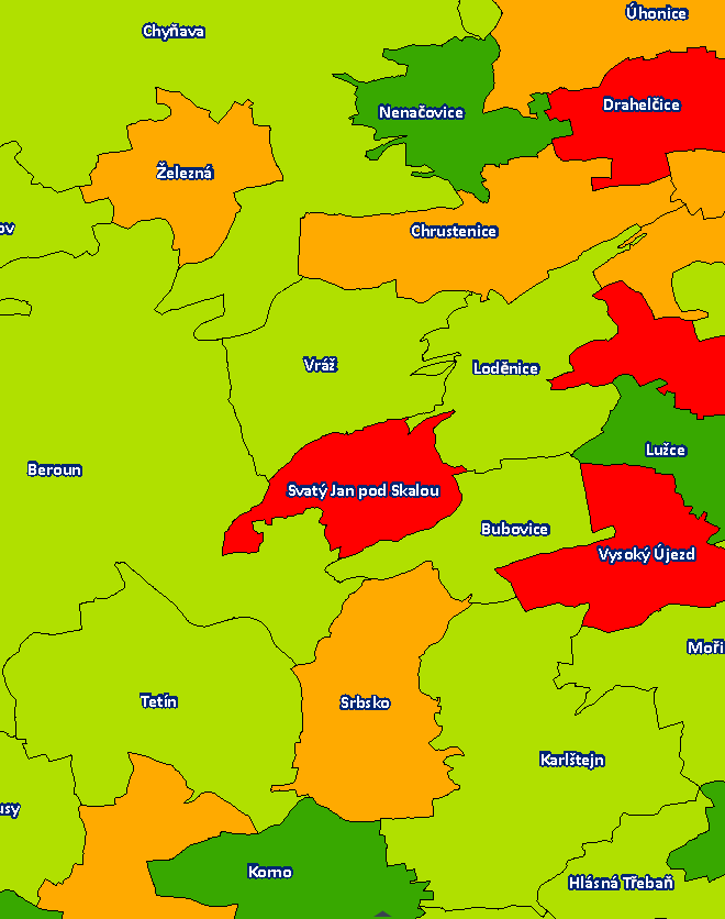 Počet nemocných je u nás setrvalý: TŘI. Vzhledem k malému celkovému počtu obyvatel nás to řadí do nejhorší (červené) kategorie.