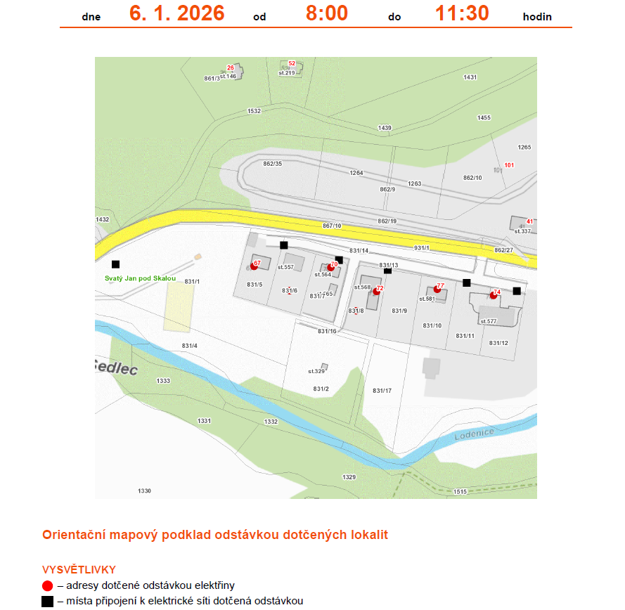 Dne 6. 1. 2026 dojde k plánované odstávce elektřiny v obci Svatý Jan pod Skalou a části obce Sedlec. Odstávka proběhne od 8:00 do 11:30 hodin a týká se konkrétních čísel popisných a parcelních čísel. Je důležité dodržovat bezpečnostní opatření, neboť zařízení zůstává pod napětím.